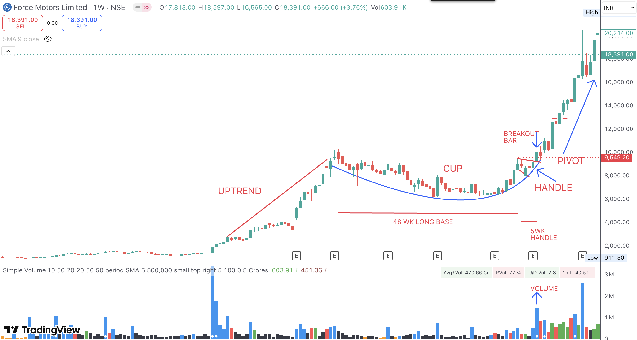 Above is the chart of a company's stock rallies from ₹2000 to ₹10000 (500% runup)over several months, then enters a 48 wk decline to ₹1000 before recovering to ₹9550. This forms the cup. Next, the stock trades sideways between ₹9550 and ₹8000 for four weeks, forming the handle. Volume diminishes during the decline and gradually increases on the recovery. On the breakout day, the stock closes at ₹9550 on high volume. A trader might set a buy order at ₹9550 with a stop of say 7-8% from pivot point.; after breaking above the handle, it doubled in the 15 weeks.